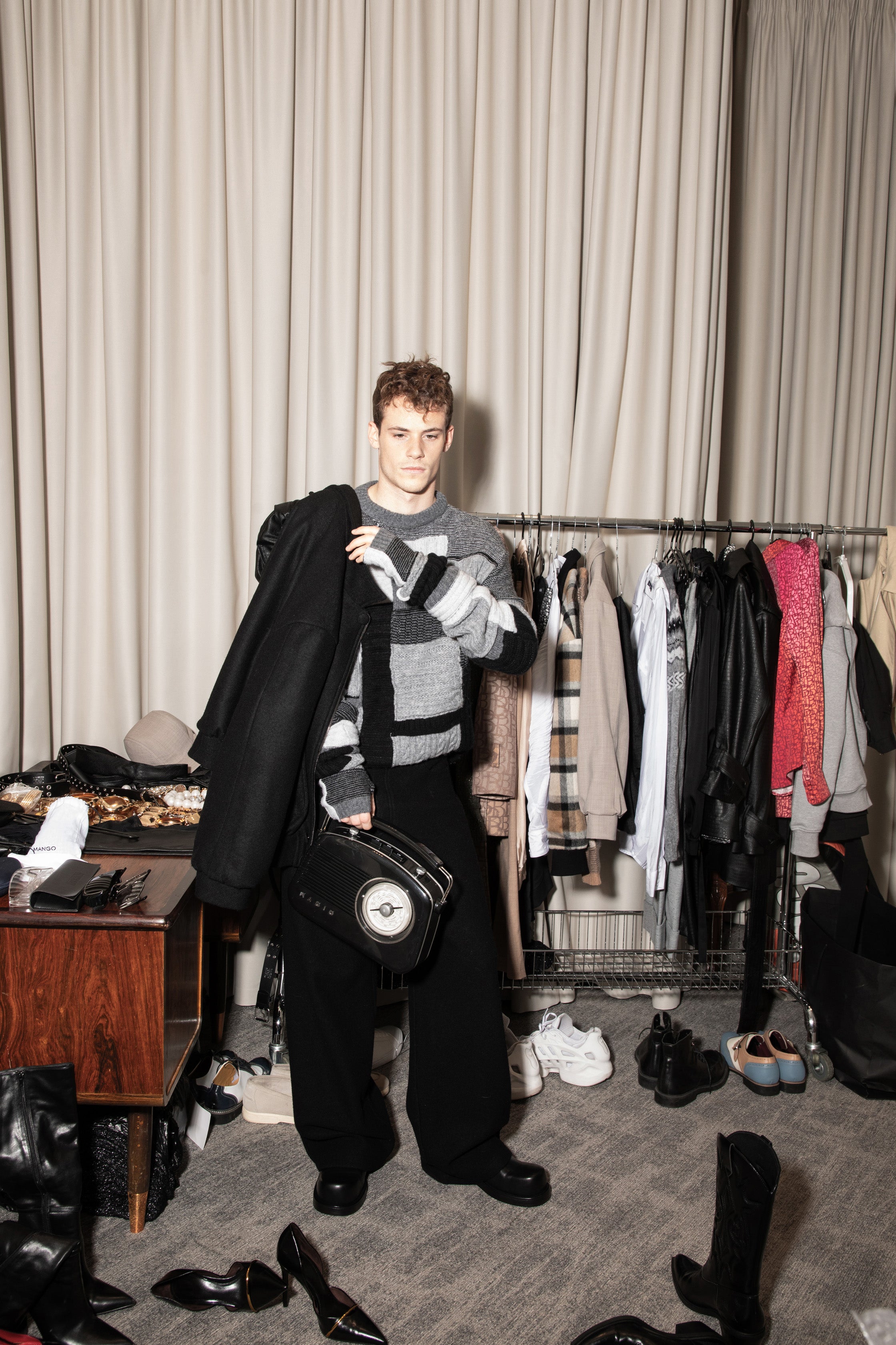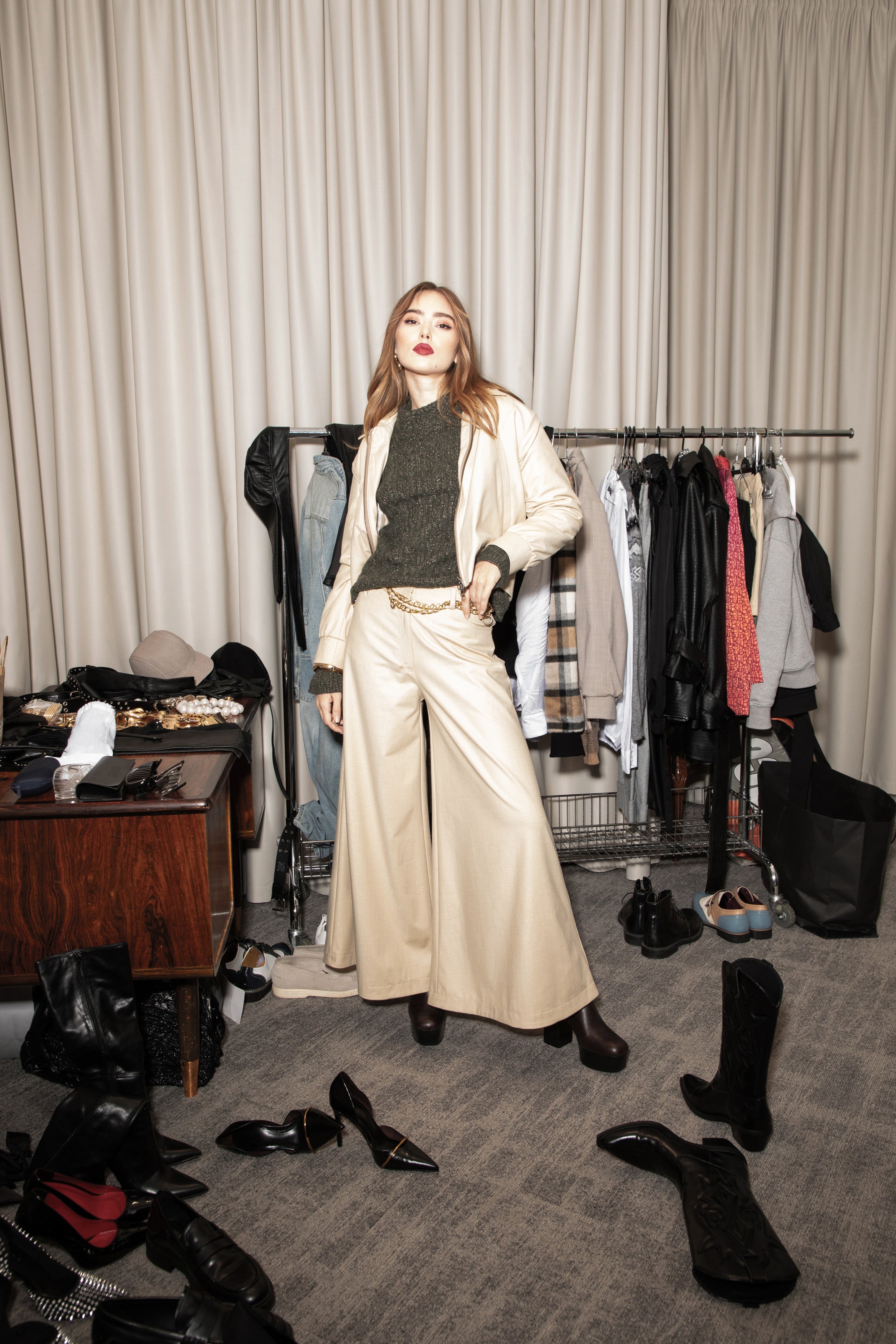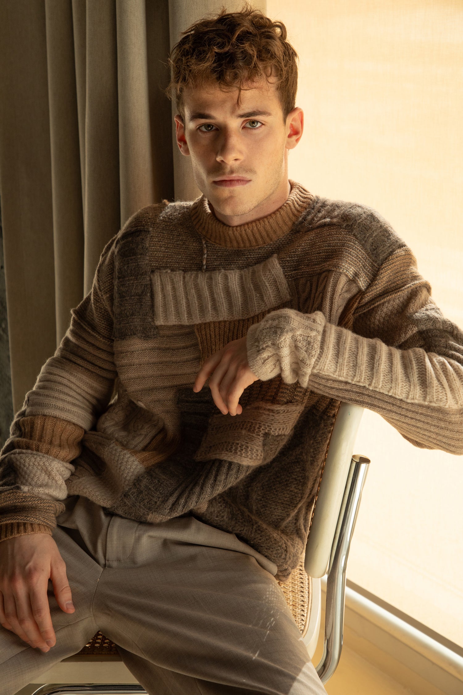 The new collection 'Knitted Emotions. Woven Classics.' is born from a desire for distinctive, unconventional details within classic forms—an answer to the fast pace of modern life. Wool patchwork tops, delicate sequins woven into knitwear, and voluminous leather pieces create a rich world of textures. The tailored lines, featuring blousons and pleated trousers, complete the silhouette with style and character.